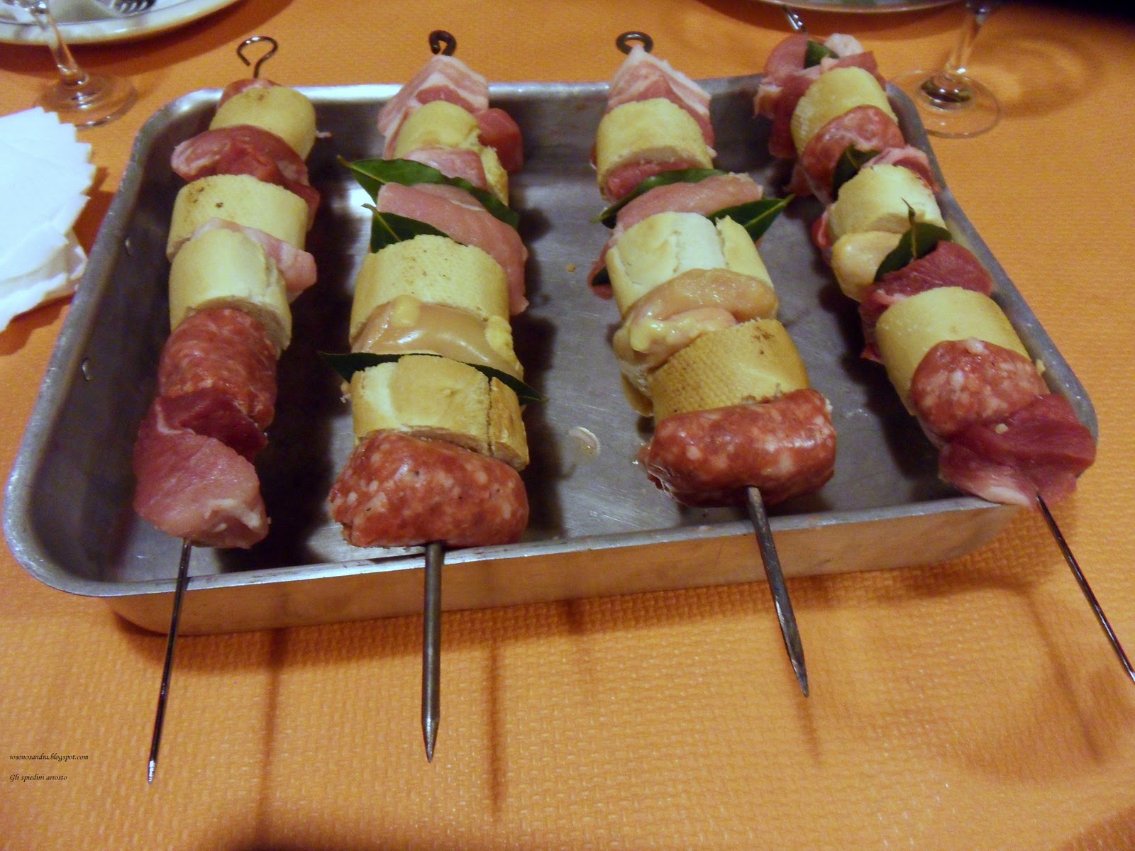 Dovete avere l’accortezza di alternare le varie carni (lavate e tagliate a pezzetti, naturalmente) con una fettina di pane e una fettina di alloro. Una volta composti gli spiedini spolverate con una miscela di sale e pepe e un filo d’olio prima di metterli nel forno.