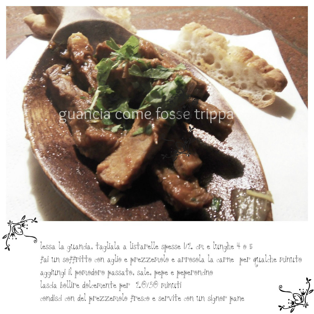 Fa parte della cultura gastronomica fiorentina usare tutte le parti interne della mucca, non si butta via nulla, pensate al lampredotto…..e allora, allora guancia di manzo come se fosse trippa.