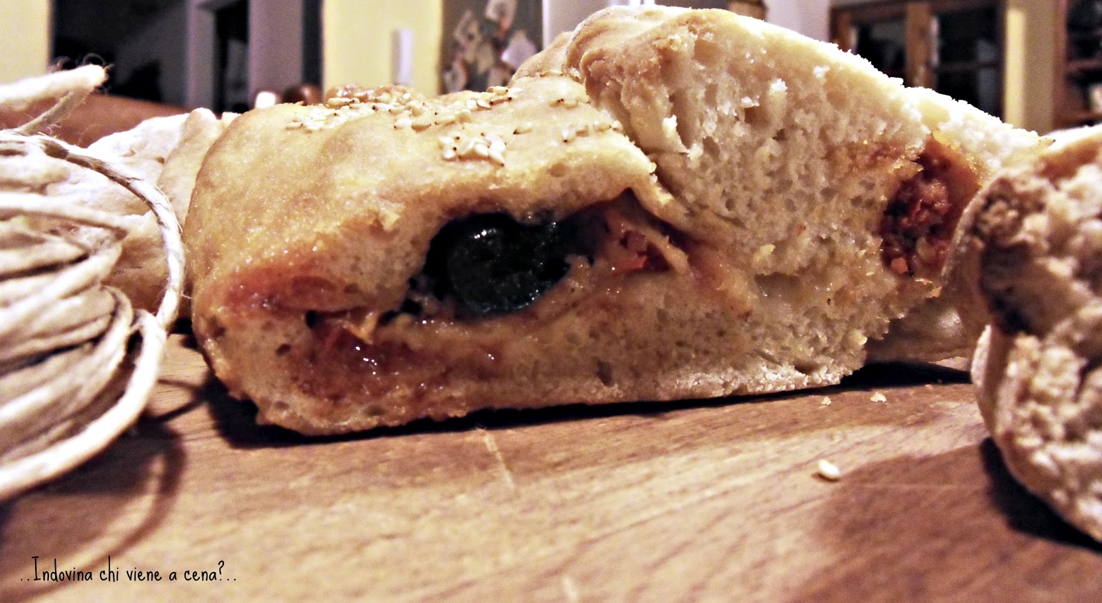 Tolto dal forno proprio dieci minuti prima di cena, in modo che si freddasse ma non troppo, ho apparecchiato e appoggiato il pane in mezzo al tavolo su un grosso tagliere di legno.