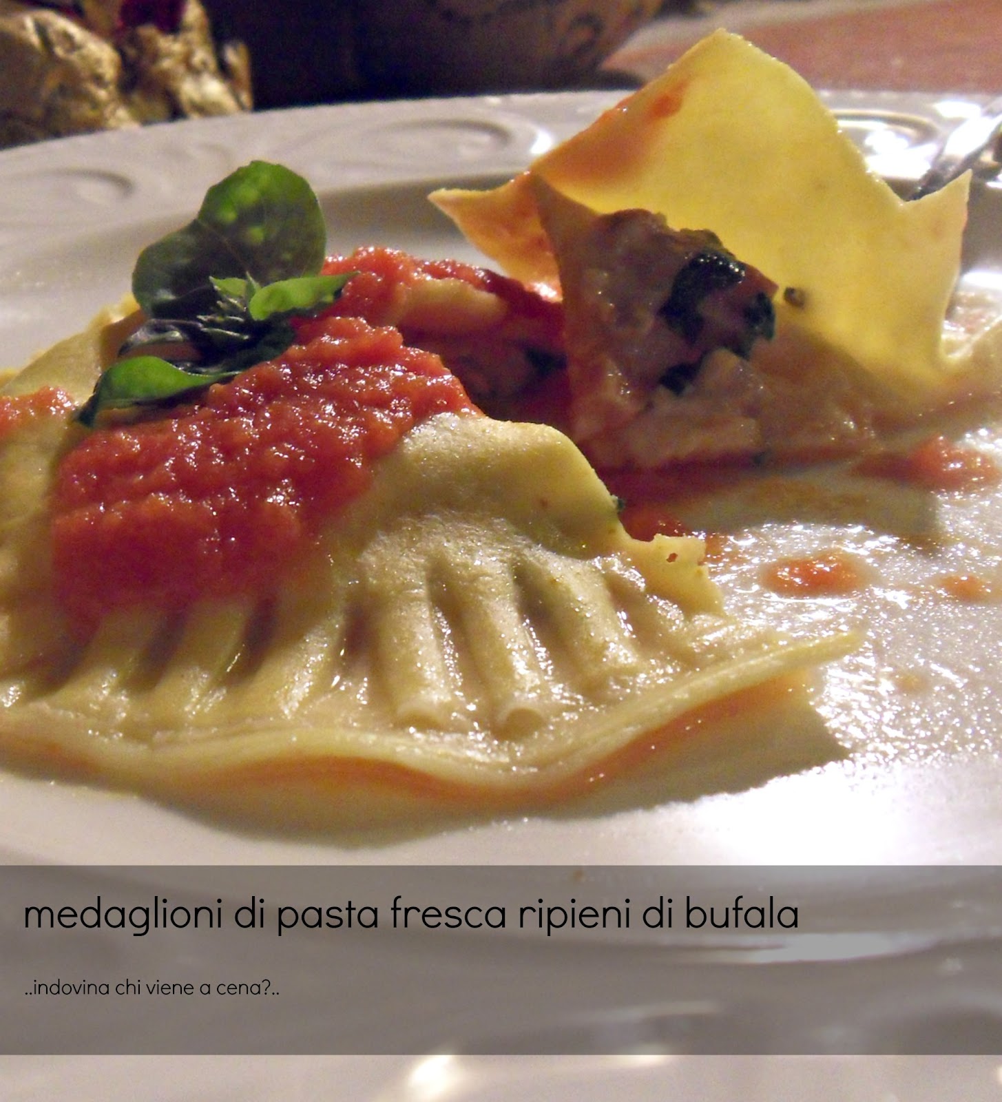 Ho rielaborato, mi perdonarà la Signorina, i suoi tortelli alla bufala e ne sono venuti fuori questi medaglioni ripieni di bufale…. perchè ce ne siamo dette tante mentre li facevamo che alla fine non abbiamo potuto che sorriderci e abbracciarci con gli occhi lucidi. Se non fosse che è dura come un macigno sarebbe una bambina stupenda, ma con quel carattere di coccio…..