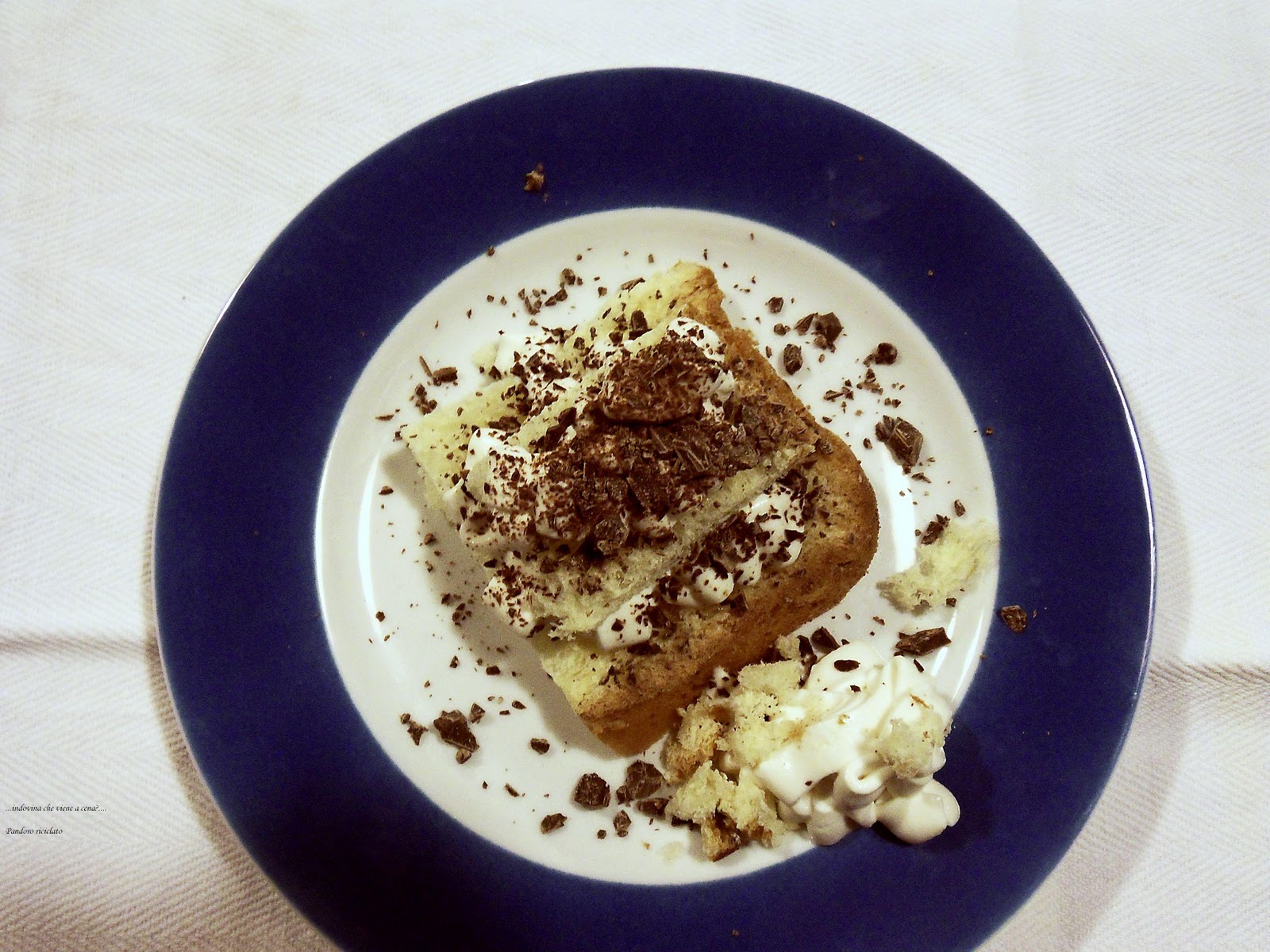 Abbiamo fatto una velocissima crema di ricotta con 250 gr. di ricotta di mucca, un cucchiaio di zucchero di canna pestato, 2 cucchiai di mascarpone e un pizzico di cannella. Abbiamo “sbattuto” tutto con le fruste e con una sac a poche (di quelle fatte in casa con un sacchetto da freezer) abbiamo guarnito i due strati di pandoro tagliato a quadrati. Cioccolato a scaglie e un pizzico di zucchero di canna anche sopra e intorno e ……via, verso l’infinito e oltre!!!! (ve lo ricordate Buzz Lightyear di Toy Story? micidiale!!)