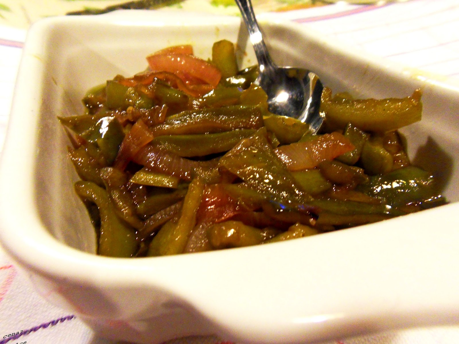 Esiste anche la versione con i peperoni, il procedimento è lo stesso solo con i peperoni verdi a punta insieme alle cipolle.