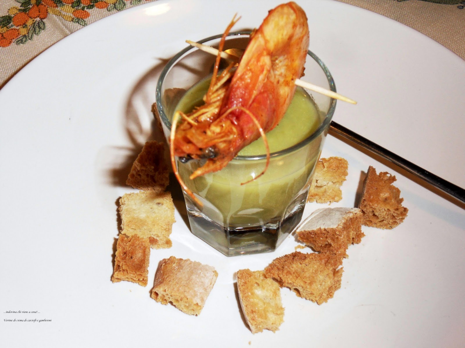 A questo punto ho messo la crema, che avevo mantenuta calda, nelle verrine e ho guarnito con un C di olivo extra e una macinata di pepe nero, ho infilato il “baffone” su uno stecchino e l’ho delicatamente appoggiato sopra la verrina: l’ ho circondata di dadini di pane e ho servito il tutto all’istante. Di solito chiedono il bis, che non dovete concedere, MAI: 10 commensali?, 10 gamberoni e 10 verrine non di più!